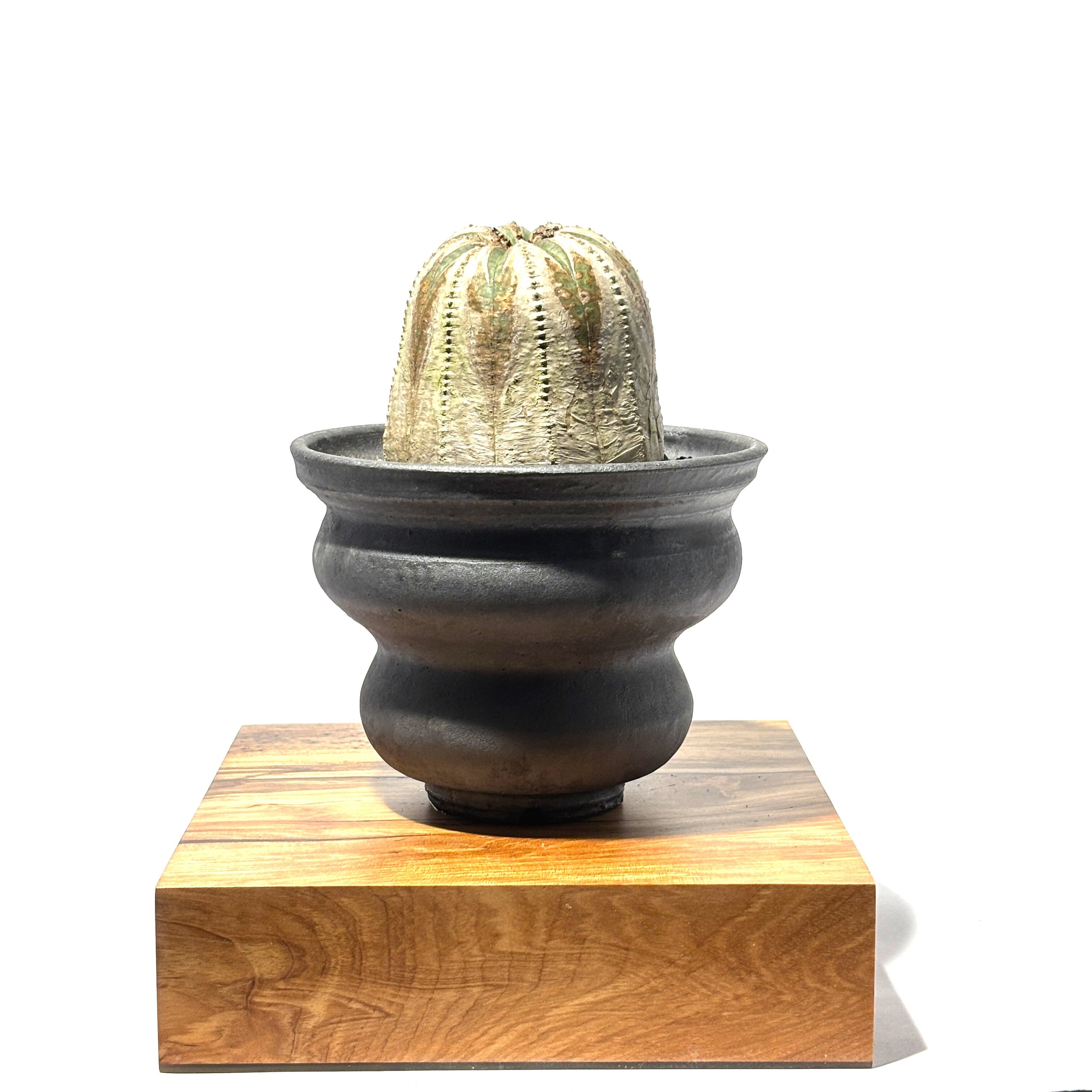 合わせる鉢は、陶芸家による「DAIROKU pot」。 この個体の持つ「高さ」と「気品」を引き立てるため、足つきのボウル形状を選定しました。 黒いマットな質感が、オベサの木質化した肌の色をより一層際立たせます。