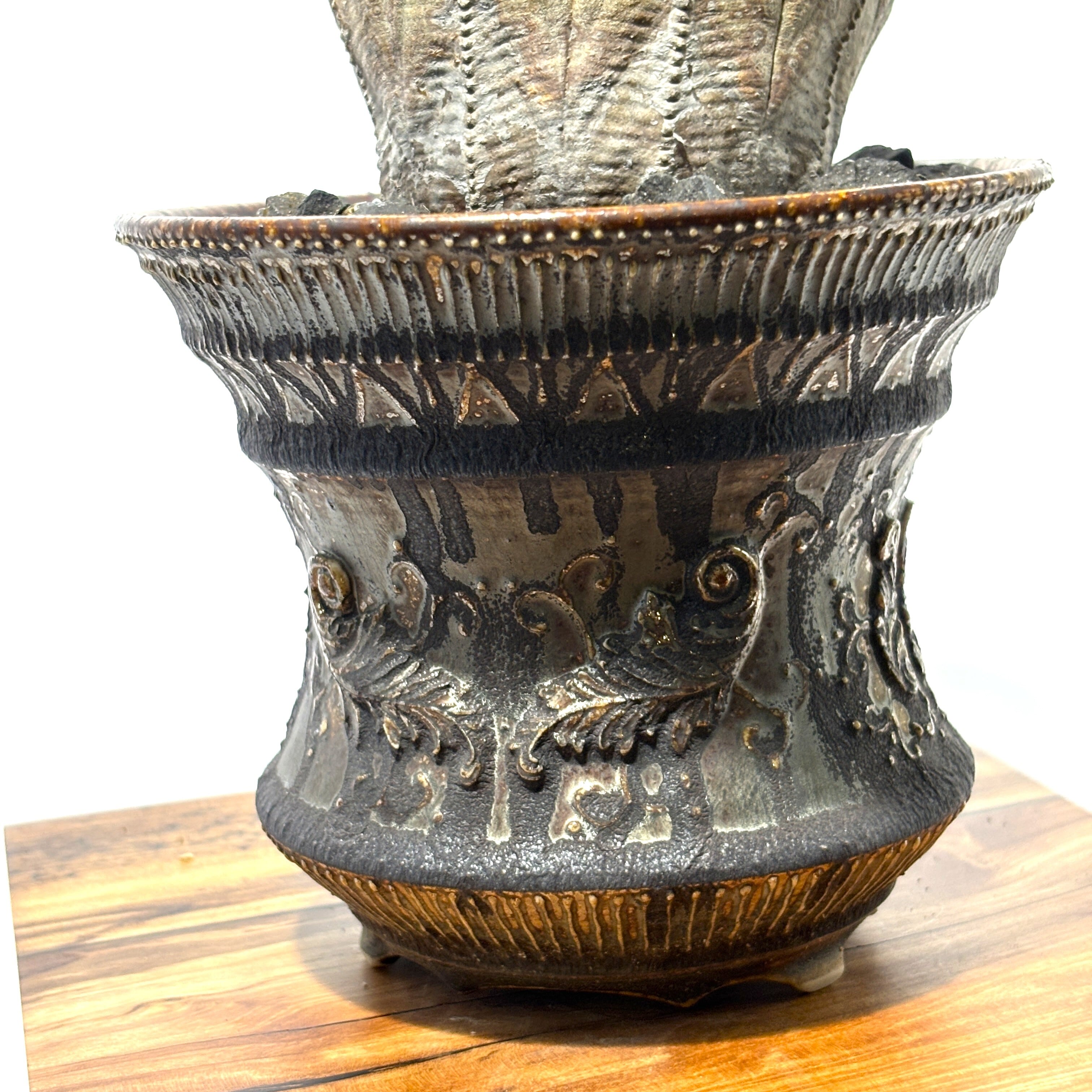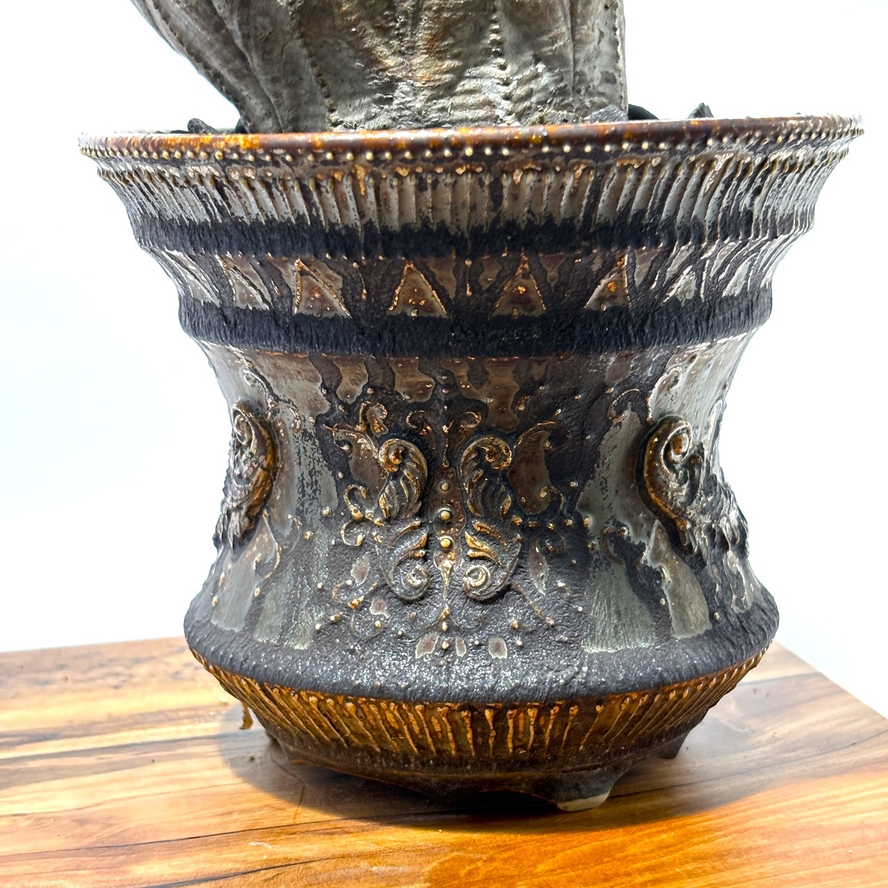 ニューヨークで生まれ、日本の美大で研鑽を積んだ彼の鉢は、国境や時代の感覚を曖昧にするような不思議な魅力を放ちます。 この鉢に見られる、まるで中世の装飾品や発掘された古代の金属器を思わせる「レリーフ(浮き彫り)」と、鈍く光るメタリックな釉薬の質感。 これらは、彼独自の感性と、九谷焼の産地で培われた確かな技術の融合から生まれたものです。